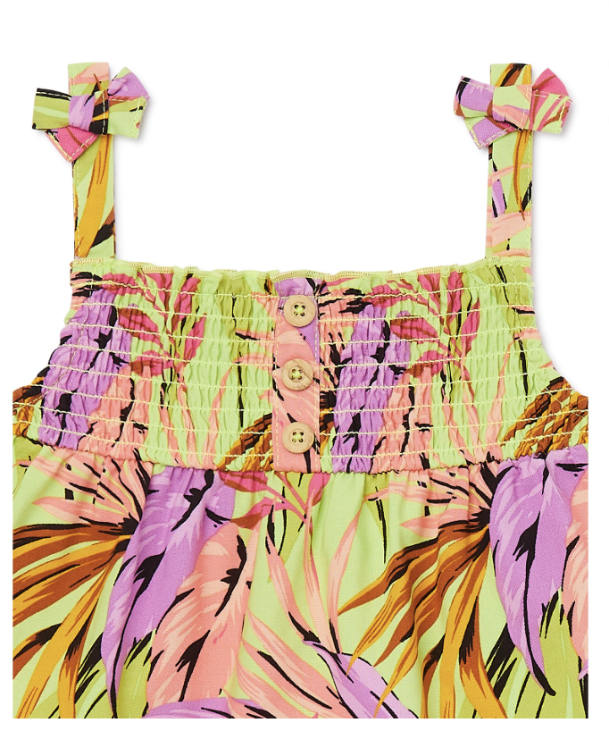 - Top features: Soft plainweave fabric; sleeveless with bow-accented shoulder straps; ruffled square neckline; non-functional button placket; smocked top